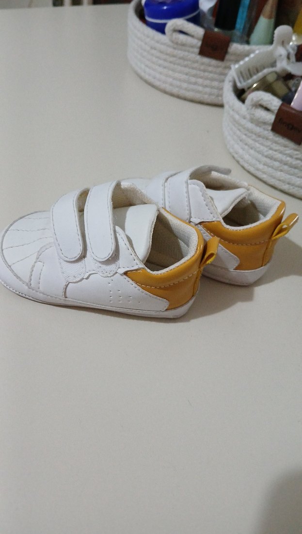Beyaz renkli, cırt cırtlı ve kauçuk tabanlı, sade sokak stili erkek bebek ilk adım ayakkabısı. Topukta hafif sarı detay bulunur.