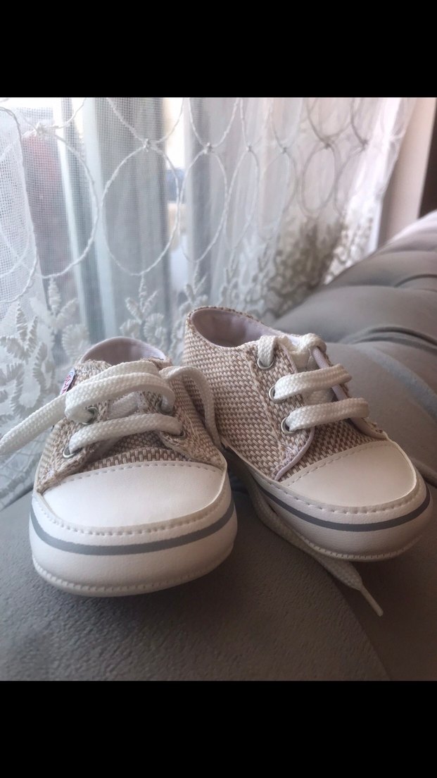 Beyaz renkli, örme kumaştan yapılmış, bağcıklı erkek bebek ilk adım ayakkabısı. Rahat ve normcore tarzda tasarlanmıştır. Sıfırdır
