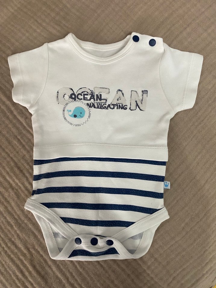 Yumuşak pamuklu kumaştan yapılmış, kısa kollu ve bisiklet yaka beyaz erkek bebek body. Basit ve kullanışlı tasarım. Temiz ürünler