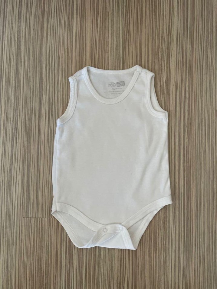 Beyaz pamuklu kolsuz erkek bebek body, yuvarlak yaka ve alt kısmında çıtçıtlı. Rahat ve sade tasarım.
