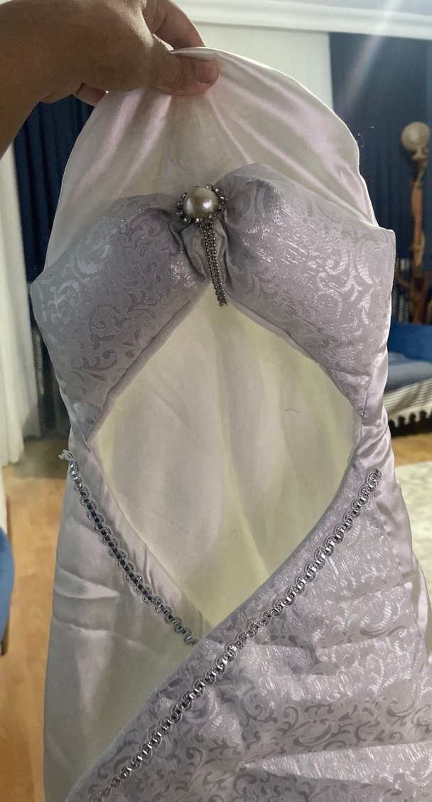 Straplez, askılı ve vücuda oturan kesimle tasarlanmış, gri brokar kumaştan midi boy denizkızı gelinlik. İnci ve zincir detaylarıyla bohem ve avangart tarzda.