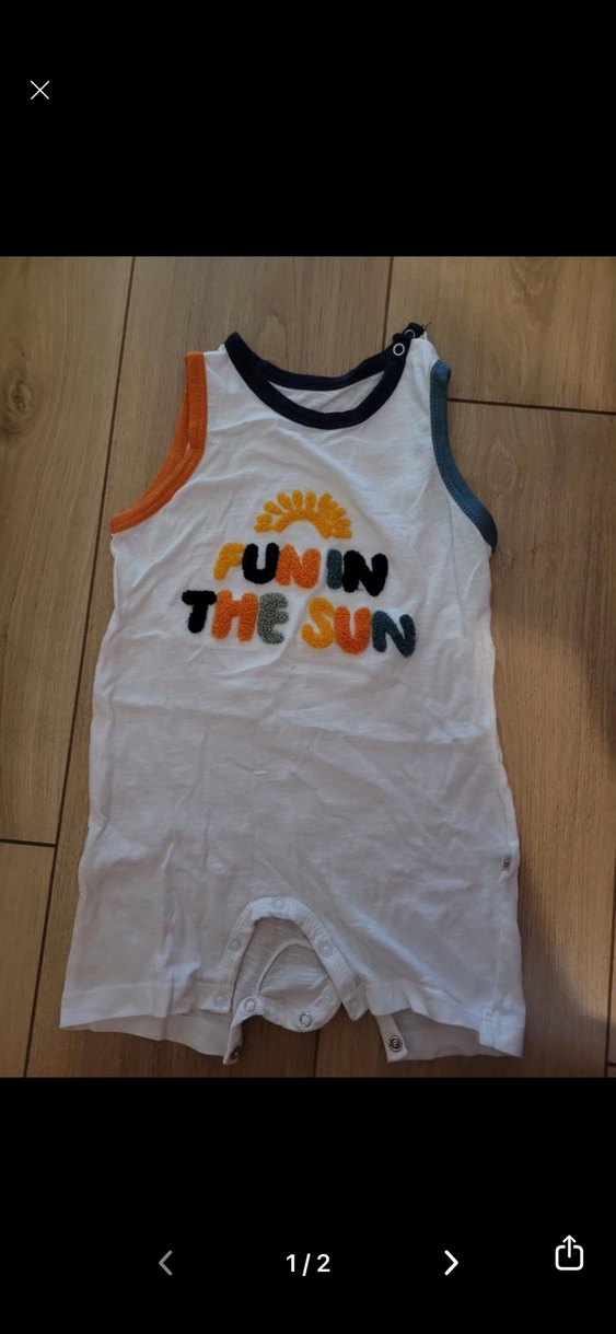 Yumuşak pamuktan yapılmış kolsuz beyaz bebek tulumu, "FUN IN THE SUN" baskılı ve kolay giydirme için cırt cırtlıdır. Streetwear tarzına uygundur. ☀️