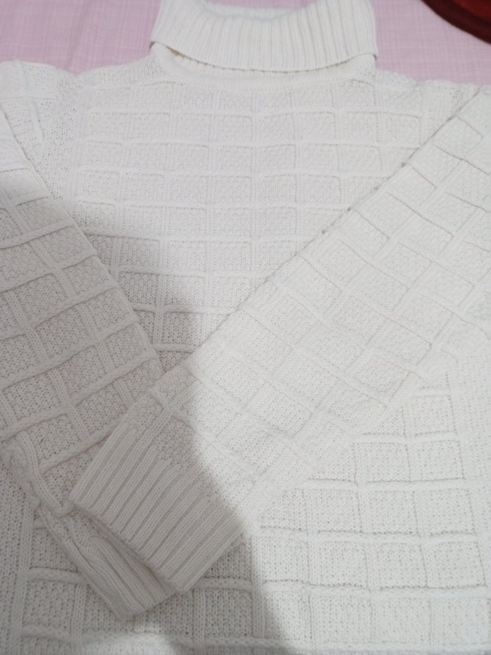 Boğazlı, uzun kollu, beyaz k Erkek kazak, rahat ve günlük kullanım için uygun, normal kesim ve örgü detaylıdır.