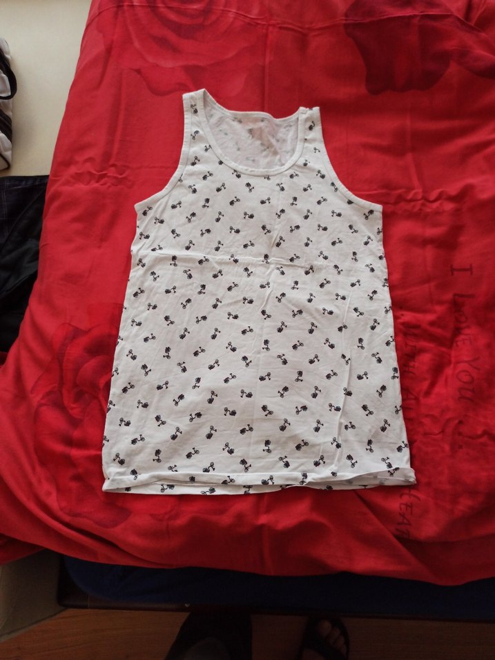Yumuşak kumaştan yapılmış, siyah küçük desenli beyaz erkek çocuk atlet.