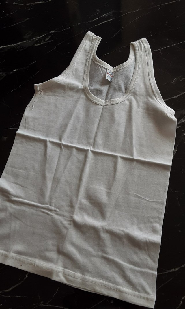 Yumuşak ve nefes alabilen kumaştan üretilmiş beyaz erkek çocuk atleti, günlük kullanım için rahatlık sağlar. Kolsuz ve desensiz tasarıma sahiptir.