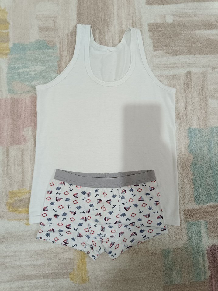 Beyaz askılı çocuk atlet ve desenli boxer, yumuşak ve rahat kumaştan üretilmiştir. Günlük kullanım için uygundur. atlet bir iki kez kullanılmıştır bower hiç kullanılmadı yepyenidir iki parça fiyatıdır