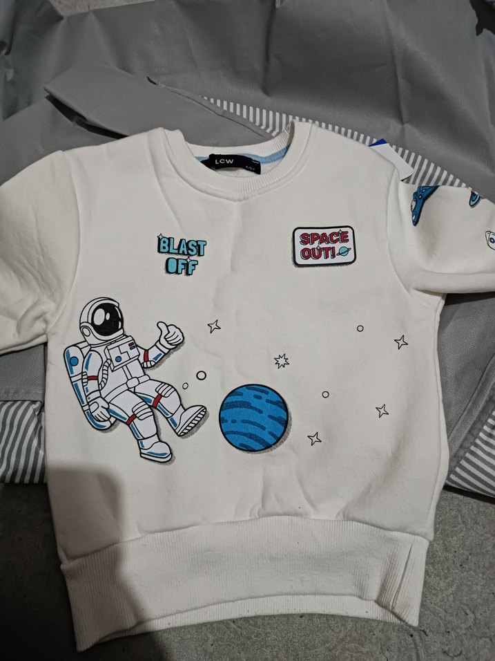 Beyaz renkli, baskılı uzay temalı, kısa kollu ve fitted kesim erkek çocuk sweatshirtü. Yumuşak ve sıcak kumaştan, yapışkan bant detaylı. Bir kez giydi küçük oldu önünü leke yapmış hemen uğraşmadım leke çıkarıcıyla çıkar diye düşünüyorum içi polarli