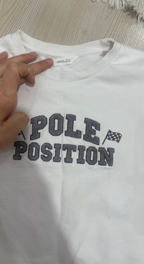 Pamuklu, beyaz renkli, kısa kollu ve bisiklet yaka çocuk polo tişört. Gri renkte "POLE POSITION" baskısı ve yarış bayrağı detayı bulunur.
