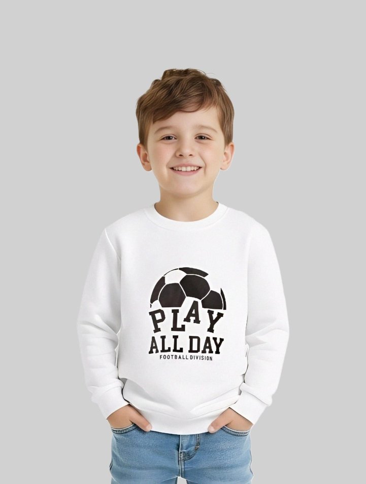 Beyaz, uzun kollu ve yuvarlak yaka erkek çocuk sweatshirtü. Renkli futbol baskısı ve "PLAY ALL DAY" yazısı bulunur. Rahat kesim ve yumuşak, sıcak kumaştan yapılmıştır. ⚽ Beden 2 Yaş 1 adet 4 Yaş 1 adet 5 Yaş 1 adet Sipariş oluştururken açıklama kısmına hangi beden istediginizi iletebilirsiniz