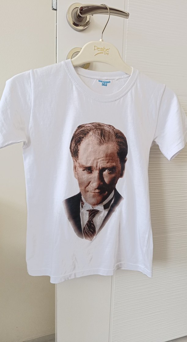 Beyaz pamuk erkek çocuk tişörtü, önünde baskılı portre ile. Yuvarlak yaka, kısa kollu, normal boy ve regular kesim, günlük kullanım için uygun.