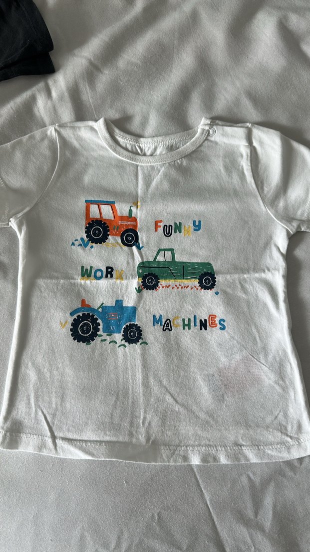 Beyaz, bol kesim erkek çocuk tişörtü. Renkli baskılı traktörler ve 'Funny Work Machines' yazısı bulunur. Kısa kollu ve yuvarlak yaka.