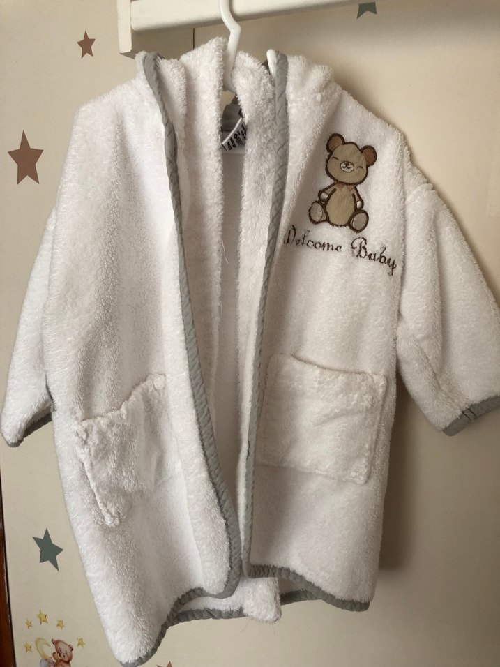 Gri detaylı beyaz erkek çocuk bornozu, üzerinde ayıcık ve 'Welcome Baby' yazısı baskılı. Yumuşak ve rahat kumaş, ön cepli.
