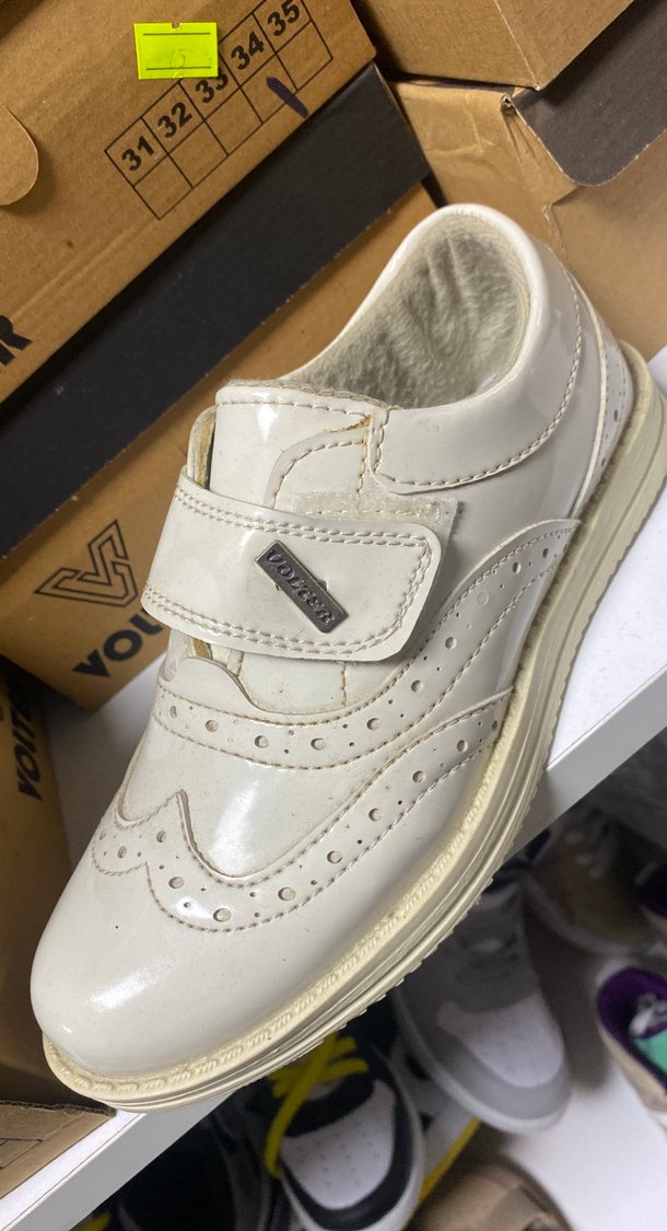 Beyaz, parlak görünümlü, cırt cırtlı, kauçuk malzemeden yapılmış erkek çocuk günlük ayakkabısı. Desensiz ve trend sokak stiline uygun.