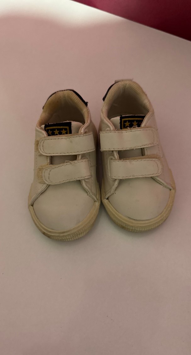 Beyaz renkli, cırt cırtlı bantlara ve kauçuk tabana sahip, sade sokak stili erkek çocuk spor ayakkabısı .