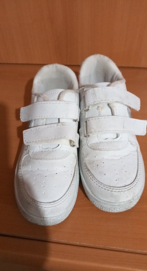 Beyaz, cırt cırtlı ve kauçuk tabanlı erkek çocuk spor ayakkabısı, sade ve açık renkli, sokak stiline uygun.