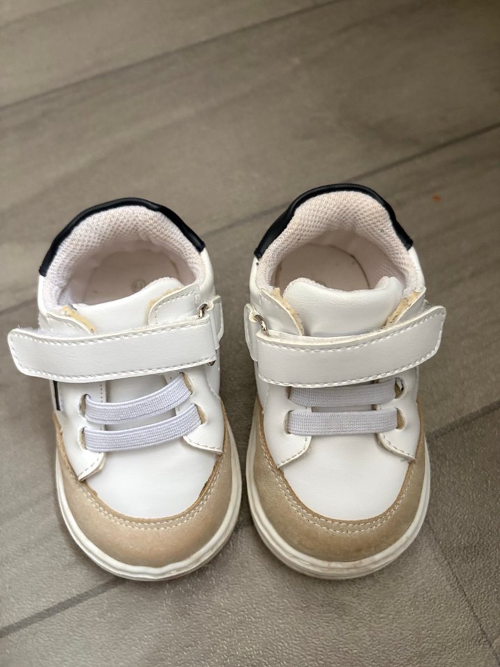 Çok az kullanıldı. Beyaz, cırt cırtlı kapama, kauçuk tabanlı ve sade sokak stili erkek çocuk spor ayakkabısı. Hafif ve desensiz tasarım.