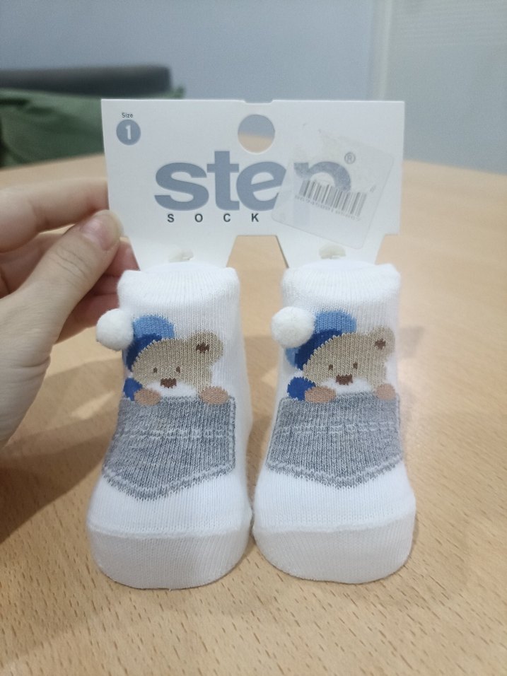 Beyaz zemin üzerine gri detaylı ve sevimli ayıcık desenli erkek çocuk çorabı, yumuşak ve konforlu kumaştan, küçük ponpon süslemeli.