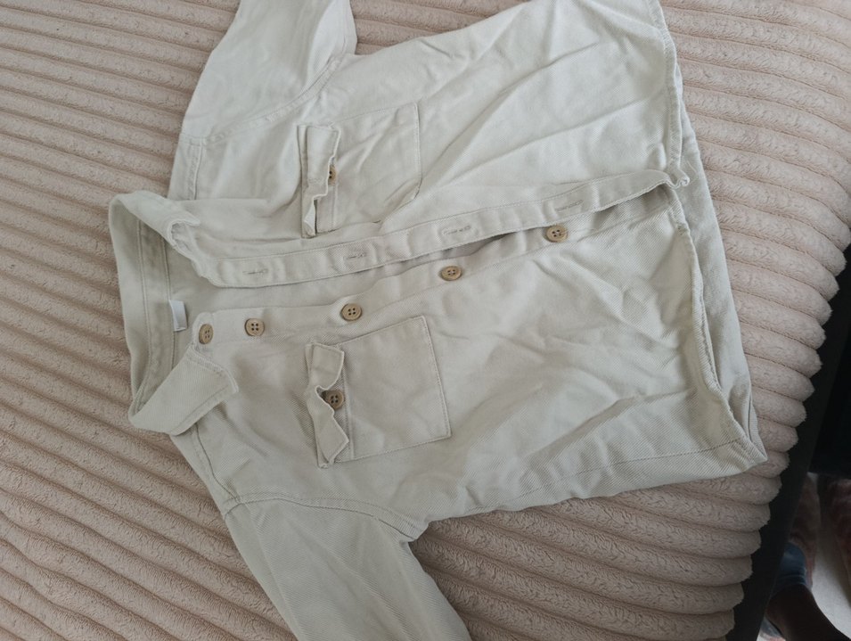 Beyaz keten kumaştan, erkek çocuklar için uzun kollu, düğmeli ve açık yaka gömlek. Rahat kesimli ve iki ön cepli, sade ve temel bir tarz sunar.