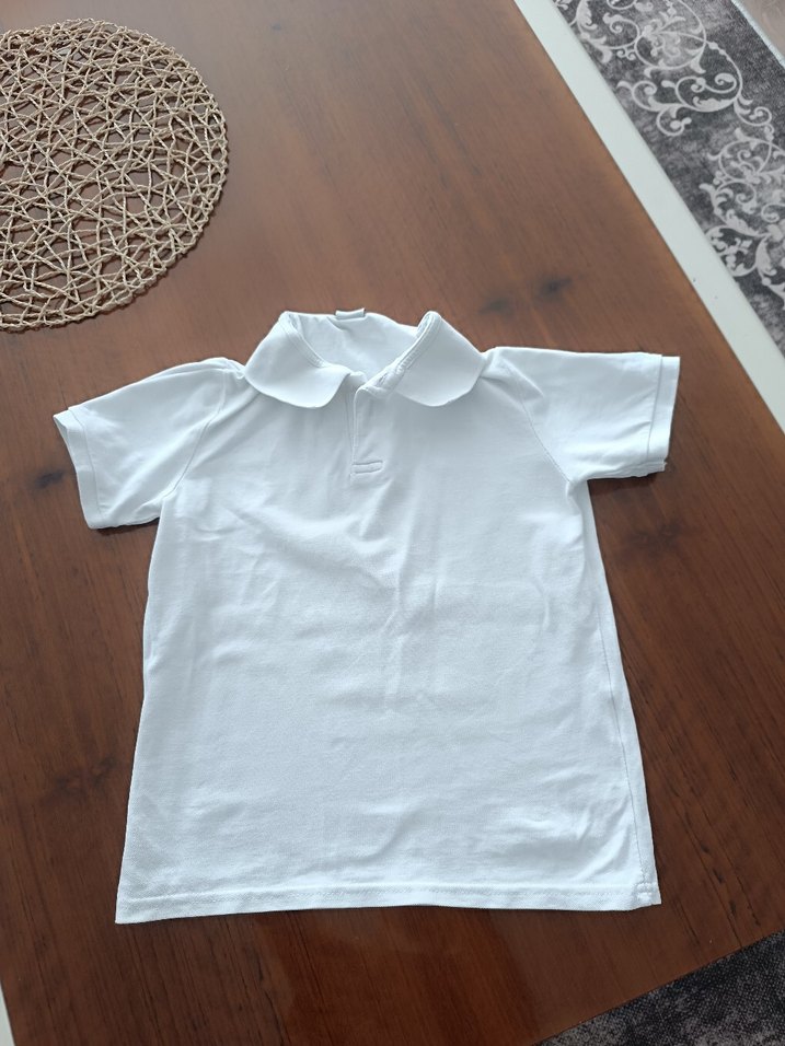 Pamuk kumaştan, beyaz renkte, yakalı ve kısa kollu, dar kesim erkek çocuk polo tişört. Sokak stili için uygundur.