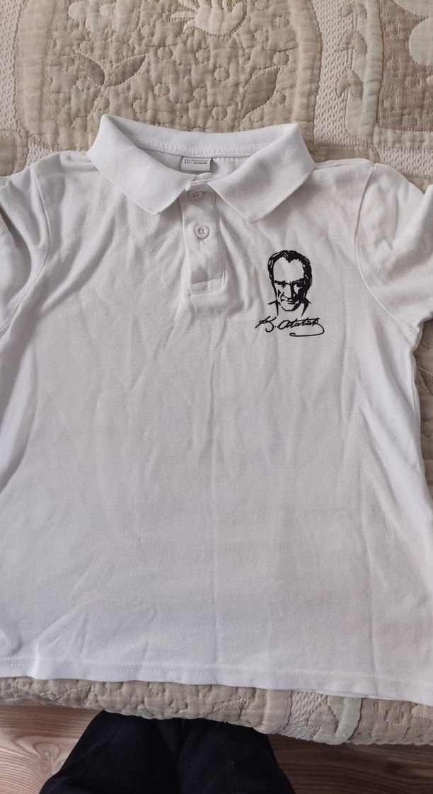 Pamuk kumaştan üretilmiş, beyaz parlak renkte, kısa kollu ve yakalı, düğmeli, baskılı erkek çocuk polo tişört. Şık ve rahat bir kesime sahiptir üzerinde hafif Sarı leke var onun dışında sorunu yok
