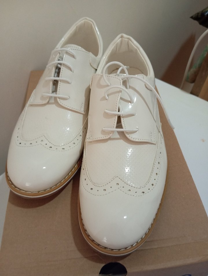 Beyaz renkli, modern klasik tarzda, bağcıklı ve düz yüzeye sahip, dayanıklı kauçuk malzemeden üretilmiş erkek çocuk ayakkabısı. Kardeşim sünnetinde sadece bir kere giydi.