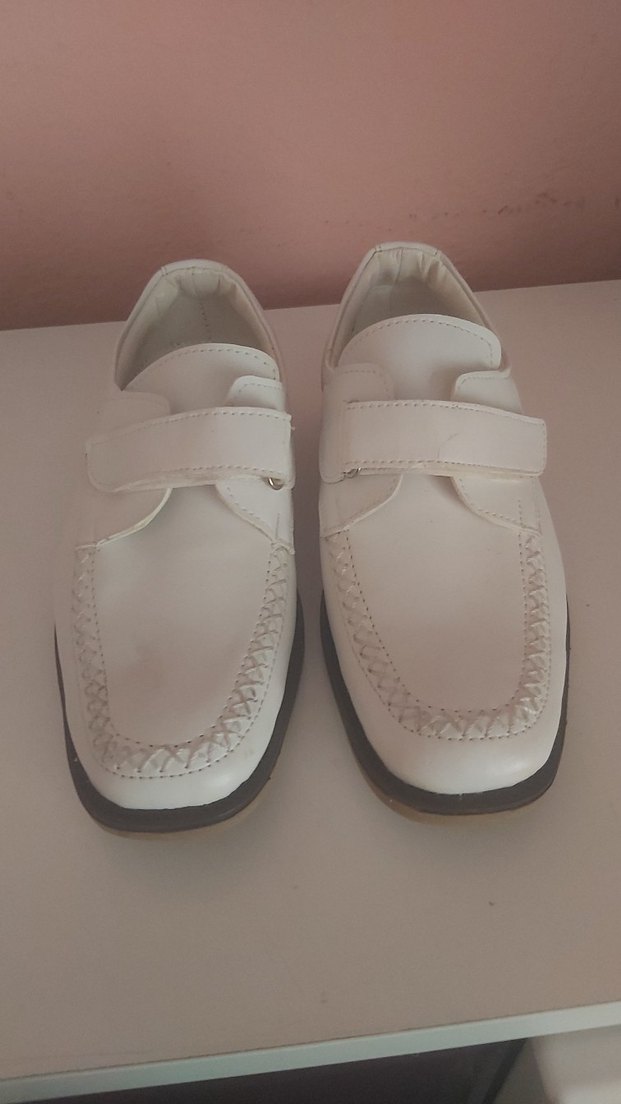 Beyaz renkte, tokalı, desen içermeyen erkek çocuk özel gün ayakkabısı. Kauçuk tabanlı, sokak stili için uygun.