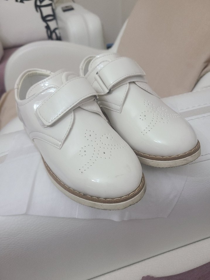 Beyaz renkli, cırt cırtlı ve dayanıklı kauçuk tabanlı erkek çocuk özel gün ayakkabısı. Düz ve hafif delikli desenli tasarıma sahiptir.
