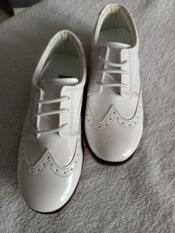 Beyaz, klasik ve sade tasarımlı erkek çocuk özel gün ayakkabısı. Konvansiyonel tarzda ve kauçuk tabanlıdır.