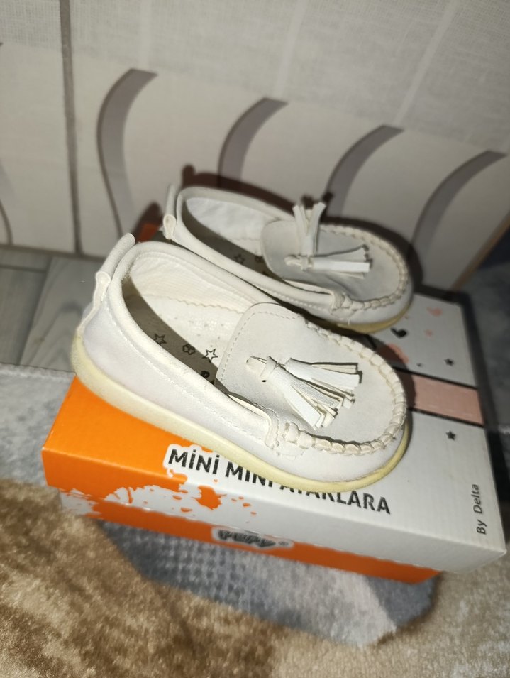 Beyaz, baskılı desenli, püsküllü detaylı erkek çocuk loafer. Kauçuk malzemeden, MiNiMIN markasına ait şık ve rahat bir model. kullanılmış ihtiyaçtan dolayı satilik