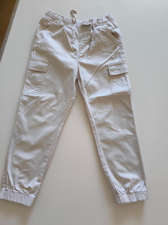 Pamuk kumaştan yapılmış beyaz, bol kesim erkek çocuk pantolonu. Cep detayları ve lastikli paçalarıyla rahat bir sokak stili sunar. sayılı giyildi dizinde yırt oldu etkinlik yaparken terziyle halledilir birşey bize küçük olduğu için goturmedik