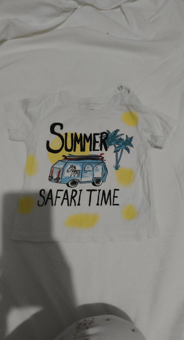 Pamuklu, beyaz, renkli yaz temalı baskıya sahip bol kesim tişört. Bisiklet yaka ve kısa kolludur.