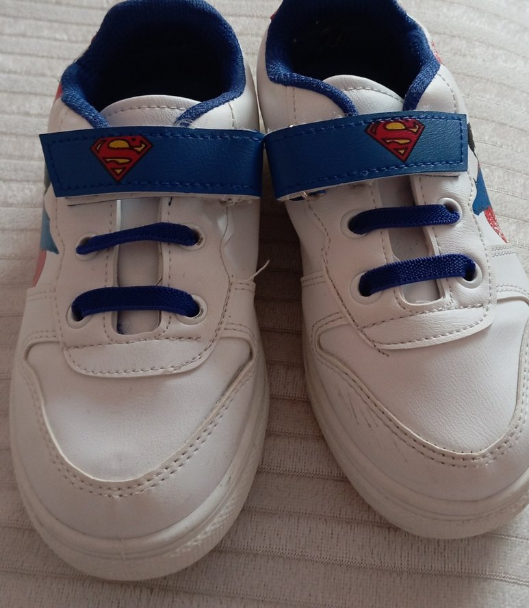 Cırt cırtlı beyaz erkek çocuk spor ayakkabısı, kauçuk tabanlı ve Superman logosu detaylıdır. Renkli ve rahat günlük kullanım için uygundur.