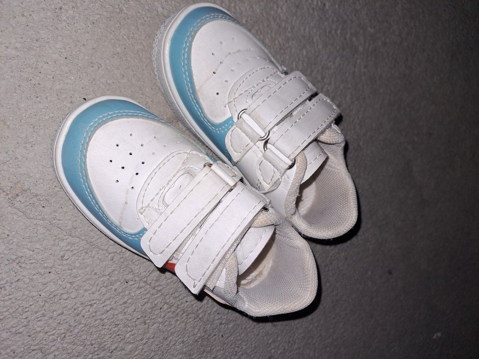 Beyaz renkli, velcro bantlı ve kauçuk tabanlı erkek çocuk spor ayakkabısı. Sade ve desen içermeyen, renkli detaylı sokak stili.