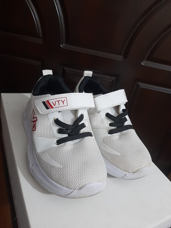 Velcro bantlı ve siyah bağcıklı beyaz erkek çocuk spor ayakkabısı, kauçuk tabanlı, 'AVTY' yazılı sade tasarım. Trendy günlük sokak stili için uygun. Gösteride 2 kez kullanıldı küçüldüğü için satıyorum hemen kargo verilir