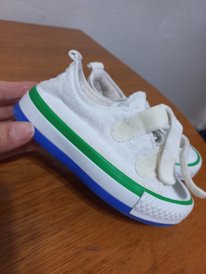 Beyaz renkli, bağcıklı ve velcro bantlı, kauçuk tabanlı erkek çocuk spor ayakkabısı. Tie-dye desenli, sokak stiline uygun.