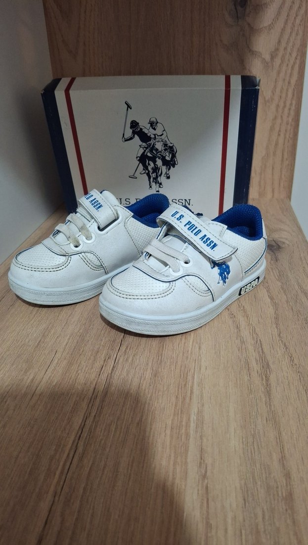 Beyaz, kauçuk tabanlı erkek çocuk spor ayakkabısı, Velcro bantlı ve baskılı detaylı. Trendy casual sokak stili için uygundur. Marka: U.S. Polo Assn.
