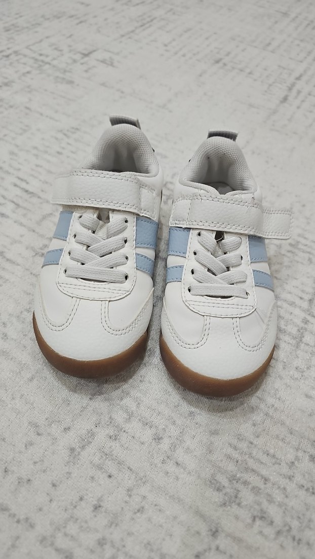 Velcro bantlı beyaz erkek çocuk spor ayakkabısı, yanlarda açık mavi şeritler bulunur. Kauçuk tabanlı, gündelik sokak stili için uygundur. Desensiz ve kullanımı kolay.