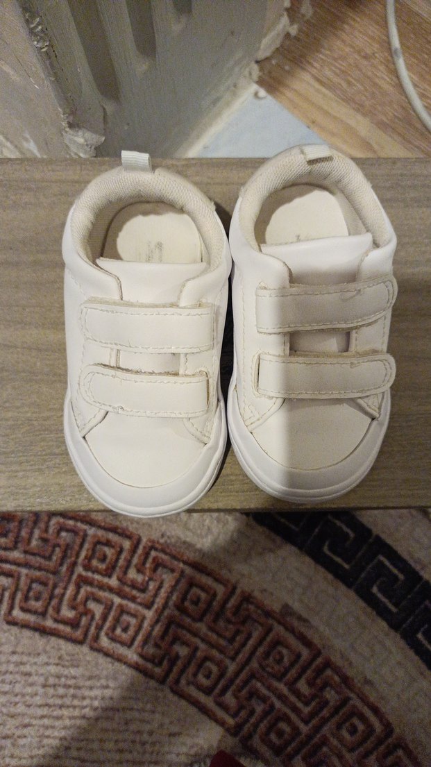 Beyaz renkli, düz tasarımlı, Velcro bantlı ve kauçuk tabanlı erkek çocuk spor ayakkabısı.