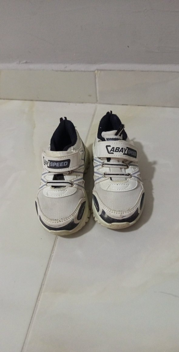 Beyaz, gri desenli baskılı erkek çocuk spor ayakkabısı, kauçuk tabanlı ve Velcro bantlıdır. Marka: CABAYS.