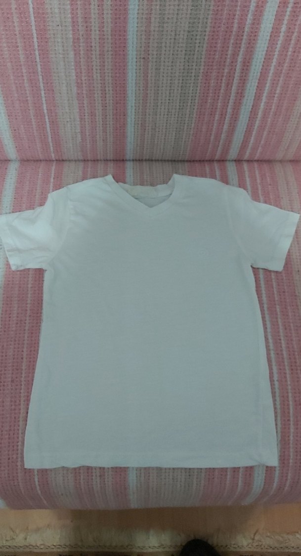 Yumuşak beyaz erkek çocuk tişörtü, kısa kollu ve sade V yaka detaylı, katmanlama için uygun.