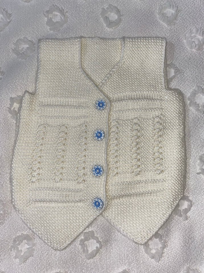 Beyaz renkli, nakış detaylı triko erkek çocuk yeleği. Kesimi regular fit, kolsuz ve kesik yaka modelindedir, mavi düğmelerle tamamlanmıştır.