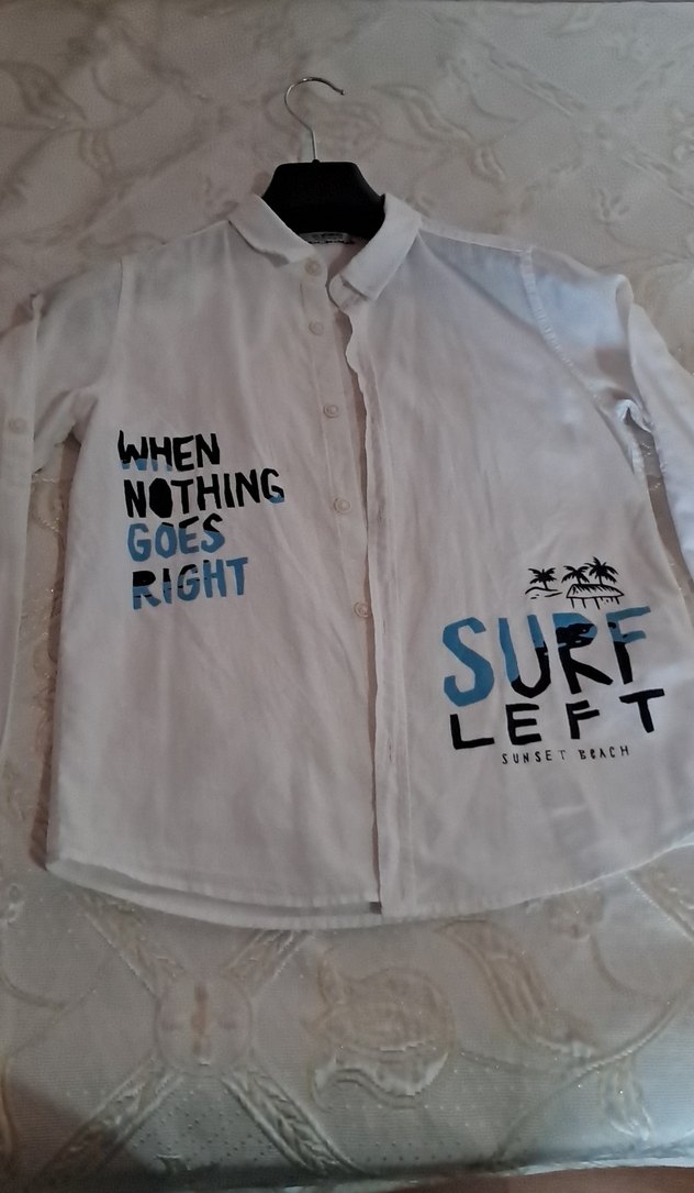 Nefes alabilen keten kumaştan üretilmiş, düğmeli, bisiklet yaka, bol kesim beyaz erkek çocuk uzun kollu baskılı gömlek.
