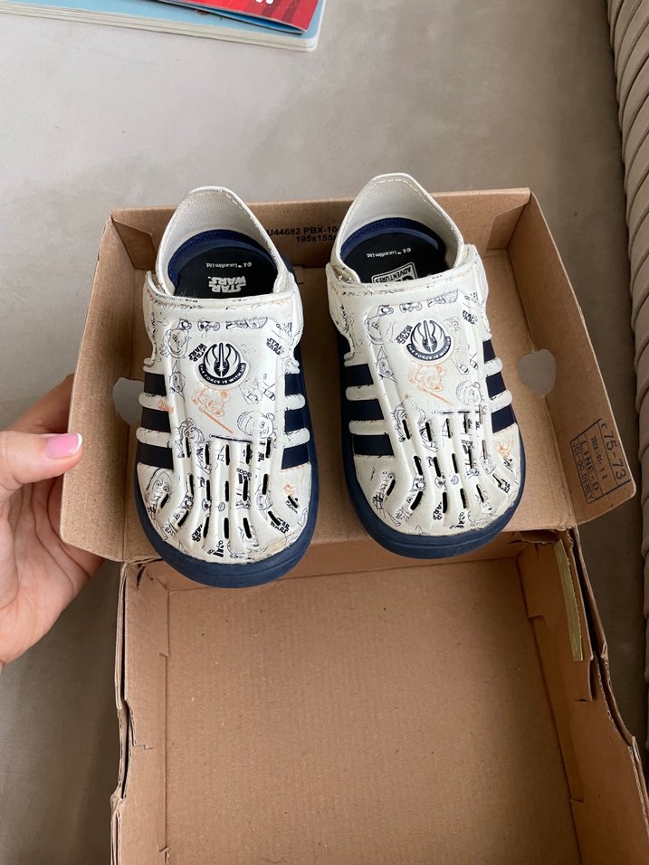 Beyaz renkli, baskılı desenli, Velcro bantlı, kauçuk malzemeden yapılmış erkek çocuk terliği.