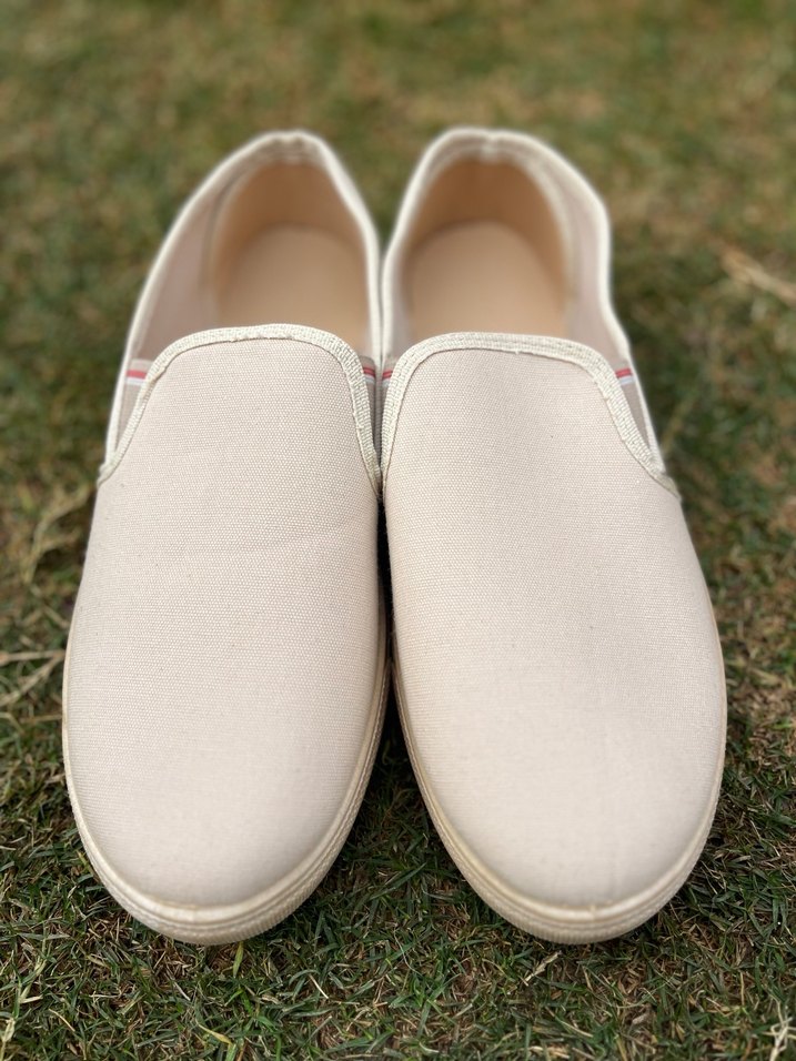 Beyaz, desen içermeyen erkek espadril ayakkabılar. Kauçuk tabanlı, sade tasarımlı ve minimalist günlük kullanım için uygun. Hiç kullanılmamıştır.