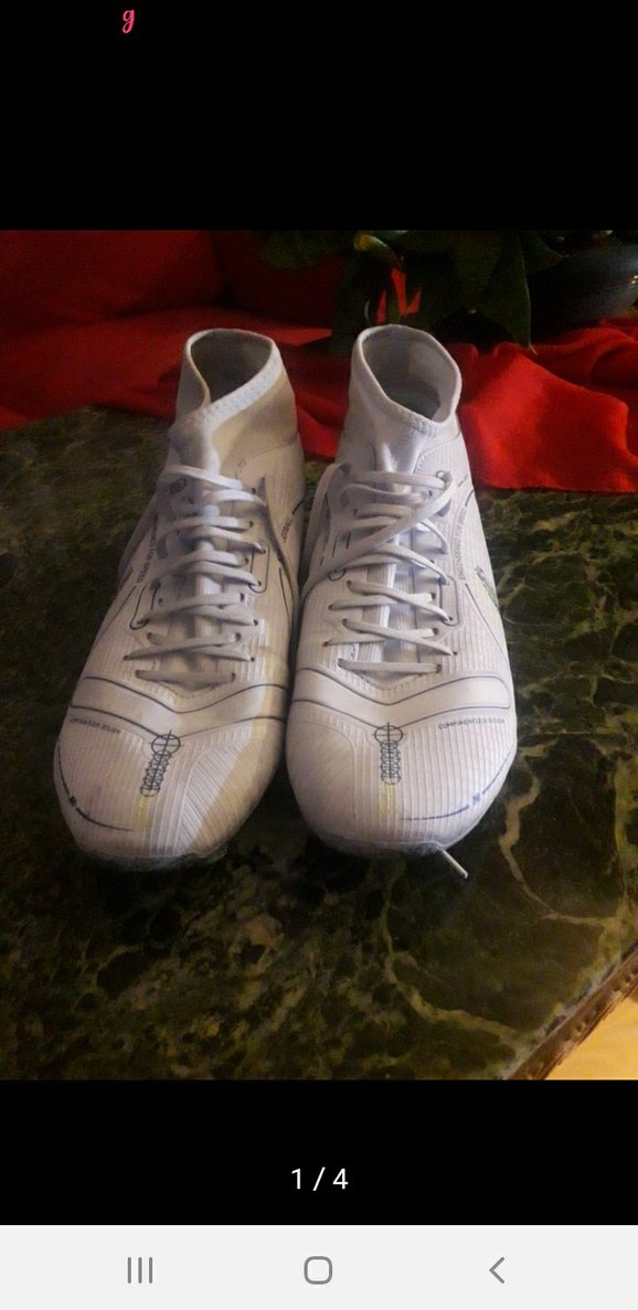 Nike Beyaz erkek futbol ayakkabısı, Velcro kapanışlı ve kauçuk tabanlıdır. Spor ve sokak stili için modern, desensiz tasarım. ⚽