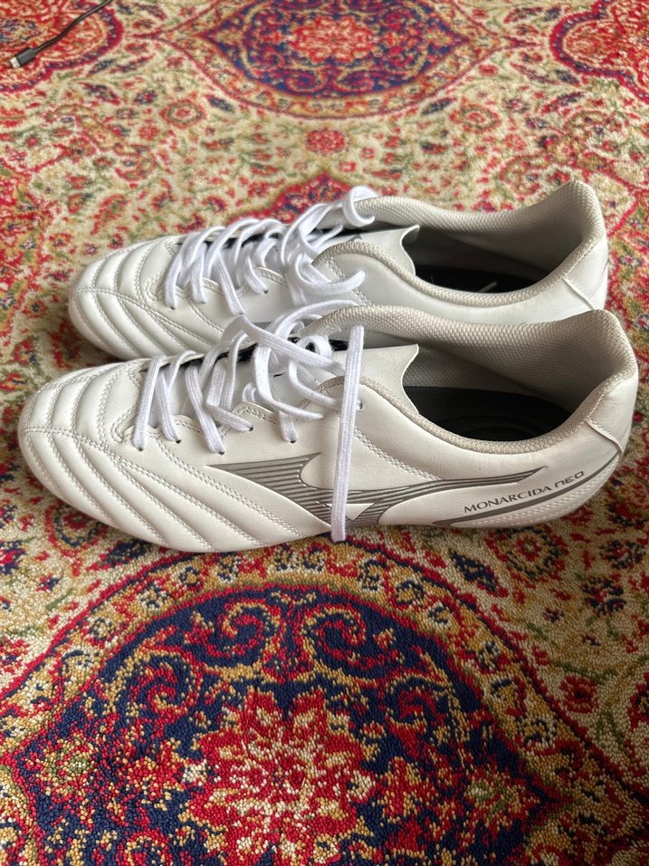 Beyaz renkli, gri nakış detaylı ve Velcro özellikli, kauçuk malzemeden yapılmış erkek futbol ayakkabısı. ⚽
