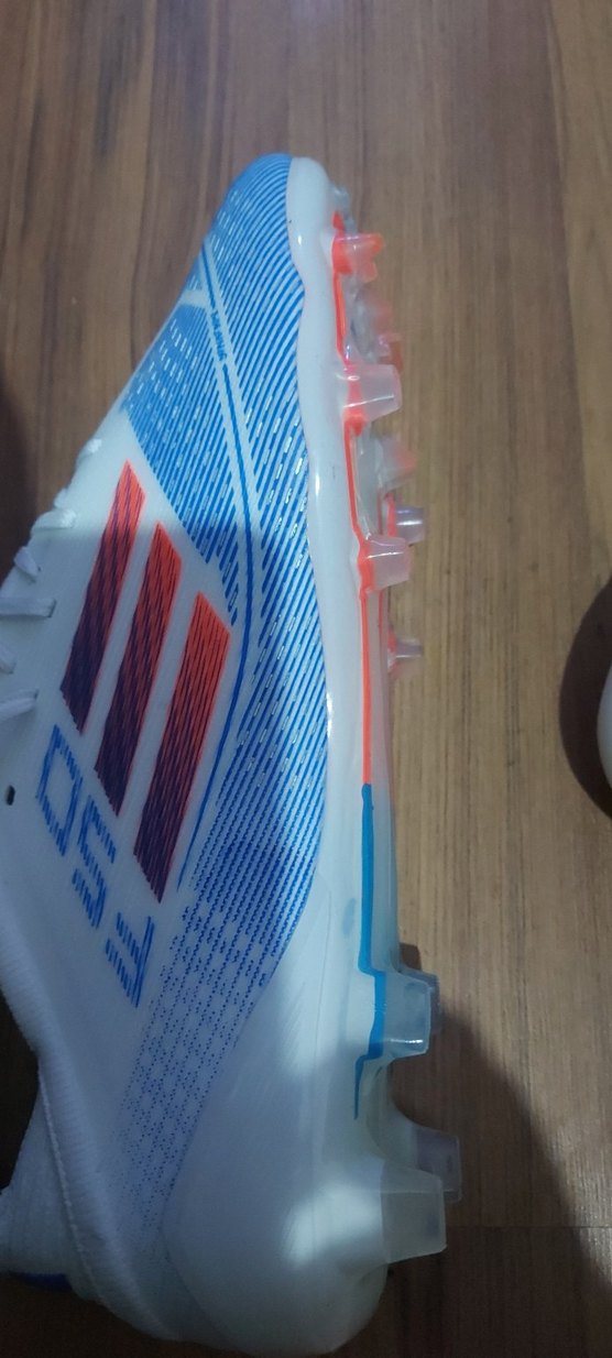 Beyaz erkek futbol ayakkabısı, baskılı desenli ve Velcro kapamalıdır. Dayanıklı plastikten üretilmiş, spor için uygundur. Çağdaş athleisure tarzına sahiptir. ⚽