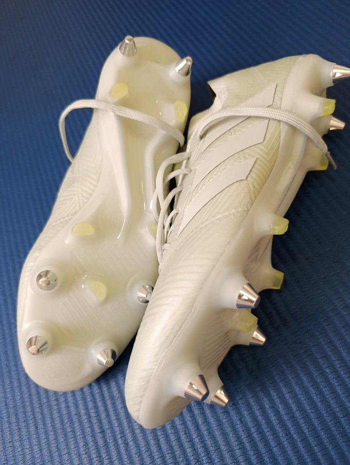 Beyaz, bağcıklı erkek futbol kramponu, kauçuk tabanlı ve metal çivili. Spor için uygun, sade ve hafif tasarımlı, athleisure ve normcore tarzına uygun. ⚽