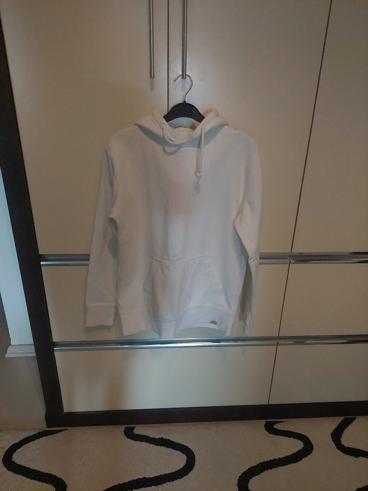 Beyaz renkli, kapüşonlu, uzun kollu ve normal kesim sweatshirt. Yumuşak ve sıcak kumaştan yapılmıştır, günlük kullanım için rahat bir seçenektir.