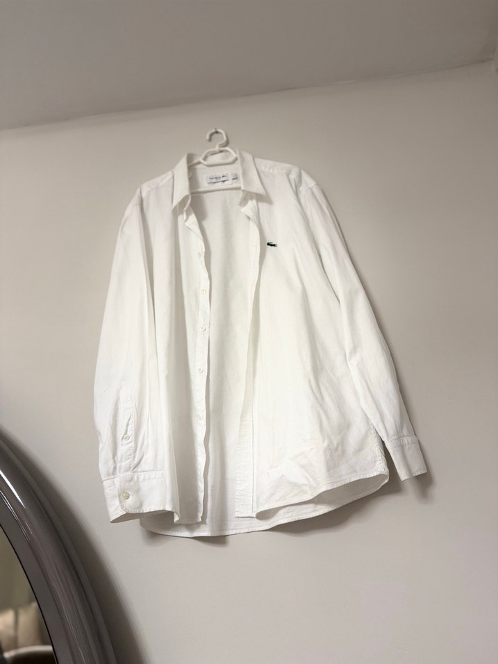 Beyaz keten kumaştan, düğmeli, uzun kollu ve normal boyda erkek gömleği. Salaş kesim, yakalı ve desen içermeyen minimalist tarzda, günlük sokak giyimine uygun.